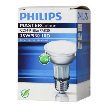 Philips CDM-R Elite 35W 930 E27 PAR20 10D lamps are LED system lamps that provides a high quality light, warm white (3000K). The light will be high quality because the color rendering index is high (90-100Ra)